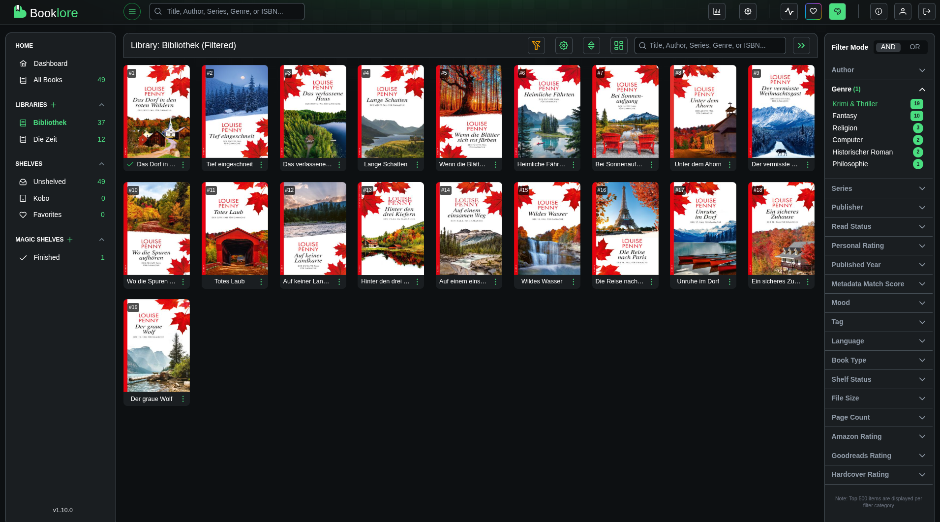 So präsentiert sich BookLore. Es gibt umfangreiche Sortier- und Filterfunktionen