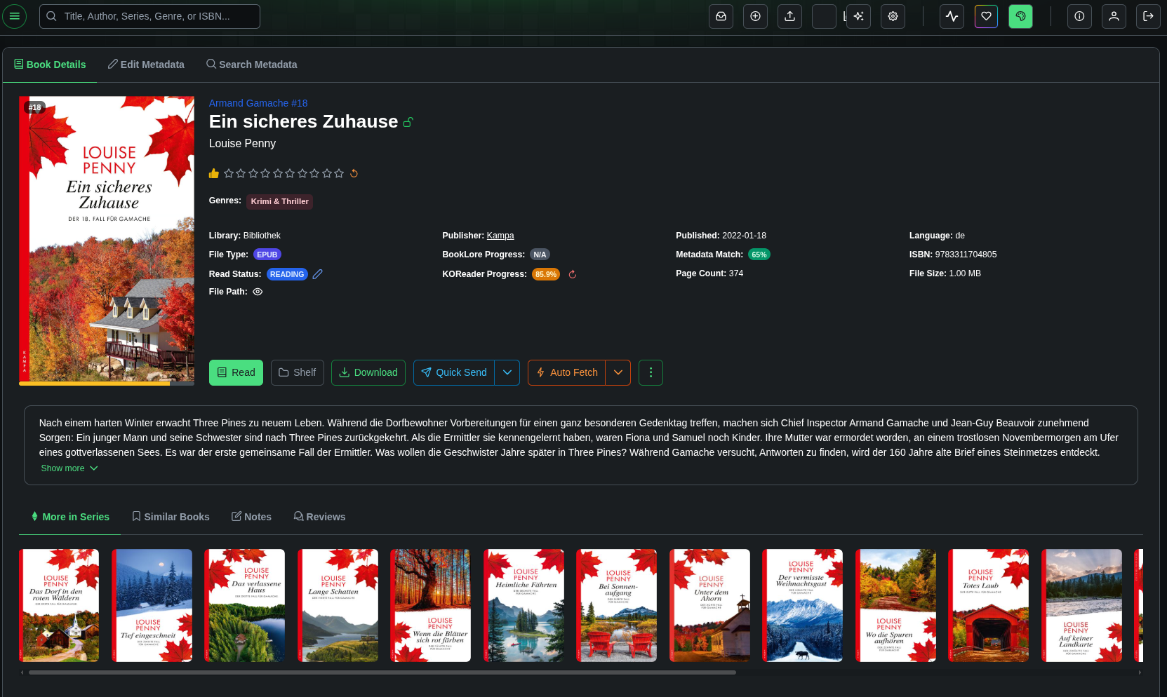 Wie oben kurz erwähnt, setze ich nach wie vor auf Calibre zum Erfassen von E-Books. BookLore bekommt dann das fertige E-Book samt aller Metadaten, weswegen ich auch auf das Abrufen der solchen aus externen Quellen verzichte. Der Import zeigte insofern noch ein paar Ecken und Kanten, als dass manche Metadaten wie die ISBN-Nummer oder gar benutzerdefinierte wie die Seitenzahlen – erstellt durch das Calibre-Plugin Count Pages – nicht erkannt wurden. Doch entsprechende Verbesserungen sind schon auf den Weg gebracht.