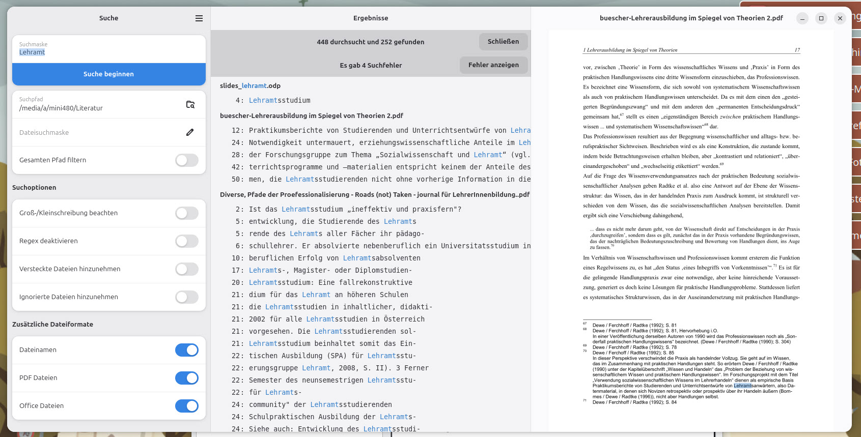 Office-Dokumente werden auch durchsucht und aufgelistet, aber die Vorschau für diese Formate ist noch in Arbeit. Dafür wird z. B. bei Folien die Nummer jener Folie aufgeführt, die das Suchwort enthält. Ein Klick auf den Dokumententitel öffnet die Datei in der dazugehörigen Anwendung. Komplexere Anfragen können mit Regex-Suchen durchgeführt werden.