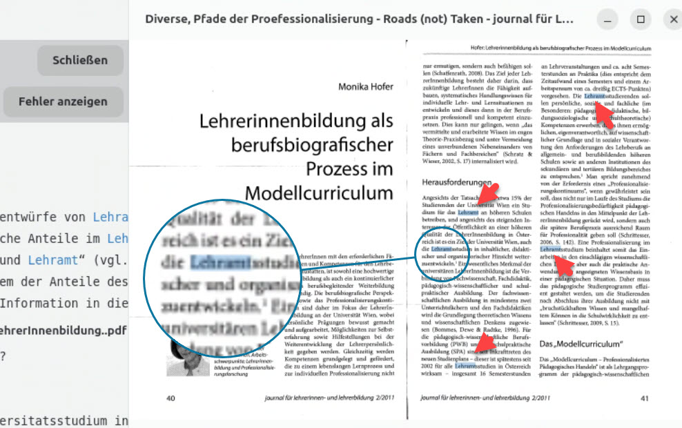 Sofern es sich um PDF-Dokumente handelt, wird zu jeder Fundstelle die Seite in einer Vorschau angezeigt - samt farblicher Markierung der Begriffe.