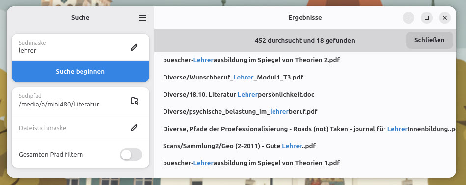 Im Laufe der Jahre haben sich bei mir unzählige (PDF-)Dokumente zum Themenbereich Lehramt und Schule angesammelt. Längst lohnt sich der Zeitaufwand nicht mehr, da noch mit Schlagworten oder systematischen Einordnungen zu hantieren - nur gelegentlich benötige heute noch ich einzelne Stellen aus dem Wust von Materialien.