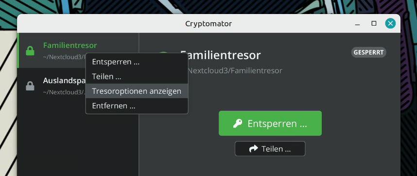Beim Anlegen eines neuen Tresors wird die Frage eingeblendet, ob man auch einen Recovery-Key dafür erzeugen möchte. Aber auch bei bestehenden Tresoren kann man diesen nachträglich generieren: Dazu den Tresor zunächst sperren, sofern er offen sein sollte. Dann per rechtem Mausklick auf den Tresornamen den Menüpunkt "Tresoroptionen anzeigen" wählen.