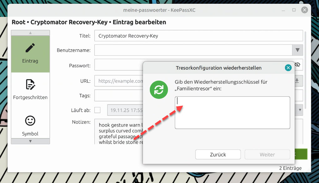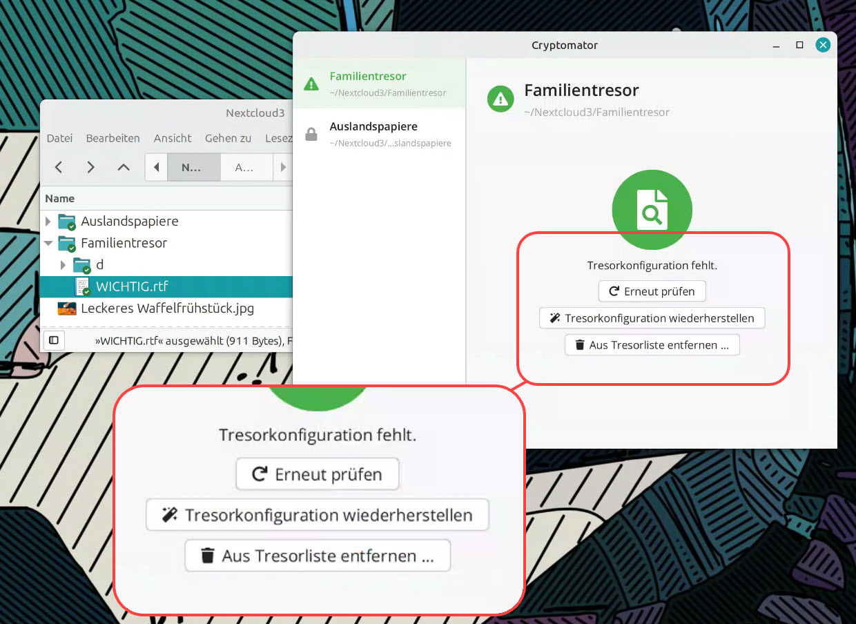 Ich habe in meinem Tresor die beiden zentralen Dateien samt deren Backup-Versionen gelöscht. Das bemerkt Cryptomator natürlich sofort und bietet an: "Tresorkonfiguration wiederherstellen".