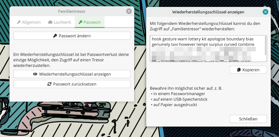 Unter dem Reiter "Passwort" gibt es den Button "Wiederherstellungsschlüssel anzeigen". Nach einer Sicherheitsabfrage erhält man einen langen Text mit sehr vielen zusammengewürfelten Wörtern. Diesen bewahrt man getrennt auf. Ich nehme dafür meinen Passwortmanager, damit der Inhalt verschlüsselt bleibt.