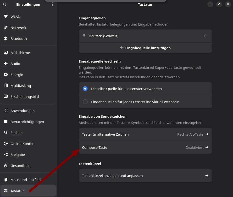 Je nach Desktop-Umgebung, ist die Compose-Taste ein- oder ausgeschaltet. Um das zu prüfen, öffnet ihr die Systemeinstellungen und wählt die Tastatureinstellungen aus. Beim GNOME-Desktop sieht das so aus: