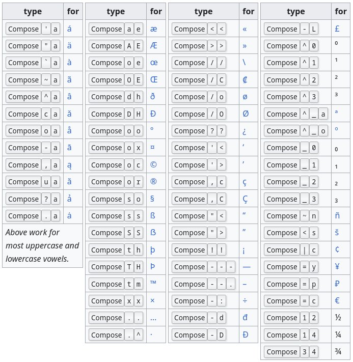 Falls es um die Möglichkeit geht, Unicode-Zeichen einzugeben, befinden wir uns auf einem viel grundsätzlicheren Level. Hier geht es nicht um irgendwelche Anwendungen oder erfundene Tastenkombinationen (wobei ich mir nicht sicher bin, ob es einen ISO-Standard für Compose-Codes gibt), sondern um internationale Standards. Deshalb ist Ctrl+Shift+u Unicode der Königsweg zu den Sonderzeichen.