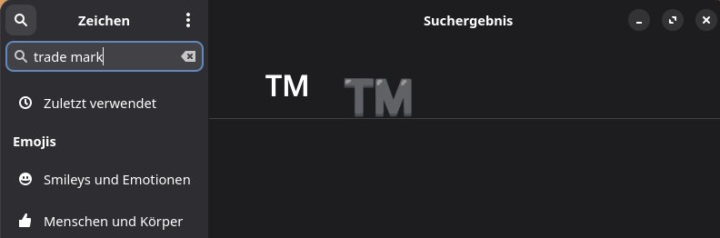 Ich habe nach dem Zeichen für "Trade Mark" gesucht und kann dieses Zeichen kopieren und in das Zieldokument einfügen. Das ist intuitiv und einfach. - Falls man keine Extra-Anwendung für das Einfügen von Sonderzeichen verwenden möchte, kann man auch direkt den Unicode des gewünschten Zeichens eingeben. Und das geht so: