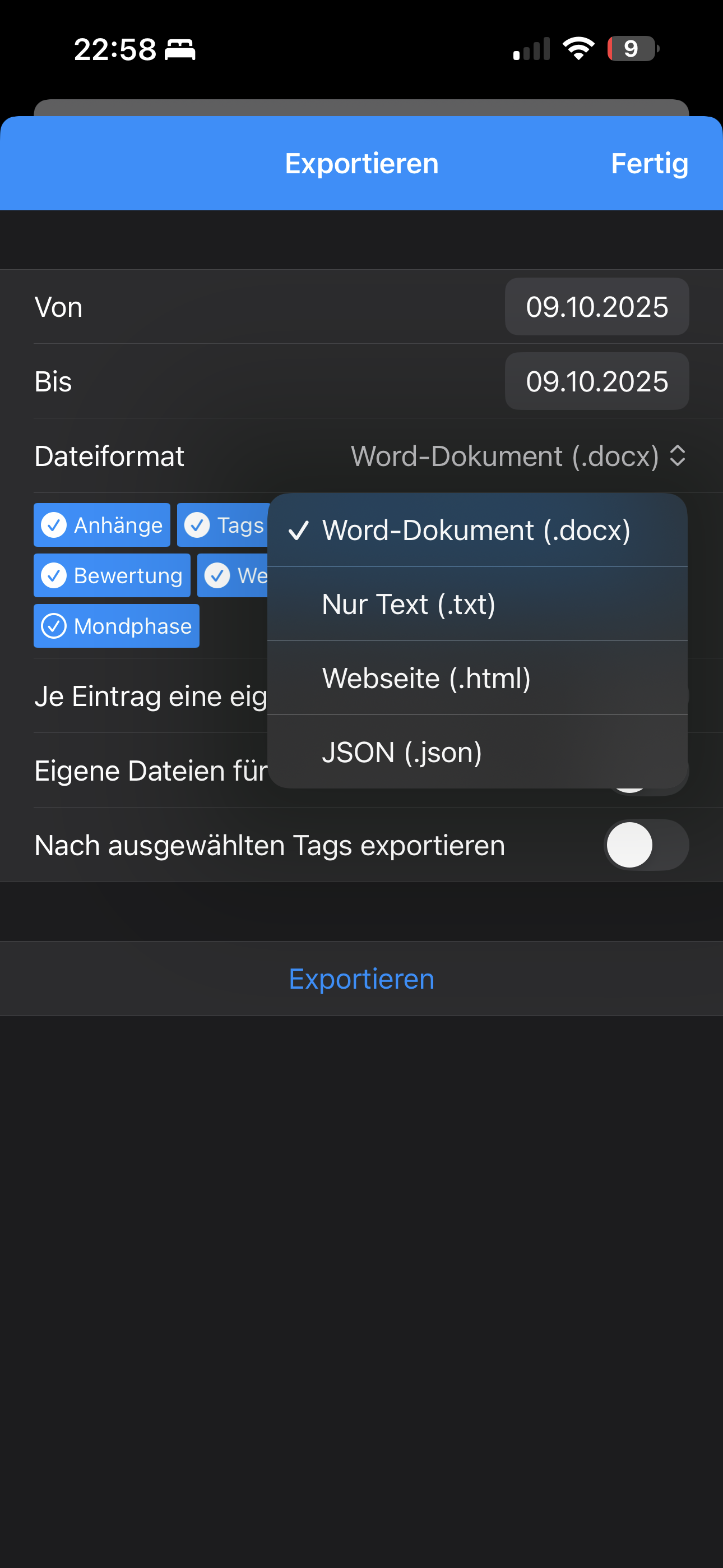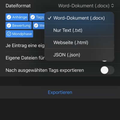 Auch der Export ist durchdacht. Ich kann auswählen, ob ich meine Einträge als Word-Dokument, Textdatei, HTML oder JSON-Datei exportieren will – inklusive Anhänge, Tags, Bewertungen und sogar der Mondphase, wenn ich das möchte. Ideal, wenn man seine Inhalte außerhalb der App weiterverarbeiten will.