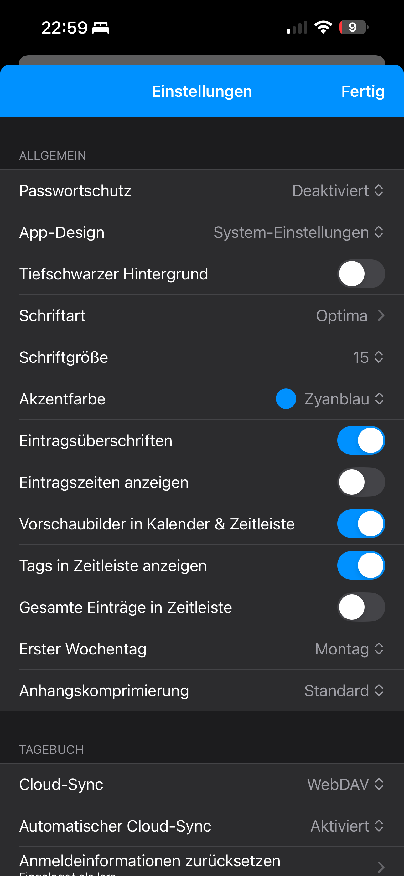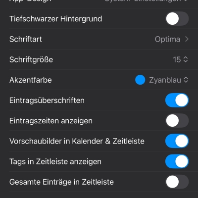 Was mir auch gut gefällt: Diarium bietet einige Einstellmöglichkeiten fürs Design. Ich nutze den tiefschwarzen Hintergrund, weil das für mich angenehmer zu lesen ist. Schriftart und Schriftgröße lassen sich ebenfalls individuell anpassen, genauso wie die Akzentfarbe. So wird die App wirklich zu meinem persönlichen Tagebuch.