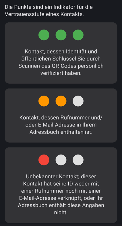 Zu jedem Kontakt gibt es im Threema-Messenger drei Vertrauensstufen, die durch ein Ampel-Schema dargestellt werden. Über die Darstellung kann man streiten. Ich hätte eine normale Ampel (grün, gelb, rot) gewählt, um die Vertrauensstufen abzubilden. Vermutlich haben sich die Designer bei Threema etwas dabei gedacht, als sie ihr Ampel-Schema entworfen haben (ein Rot, zwei Orange, drei Grün). Egal, im letzten Bild seht ihr, welche Bedeutung die drei Ampelphasen haben.
