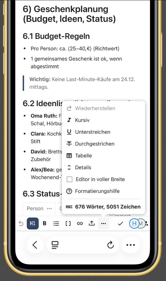 Nicht unwichtig, gerade wenn es z. B. an Familienangehörige gesendet wird: Viele nutzen kaum noch einen PC oder ein Notebook im Alltag. Fast alles wird über das Smartphone erledigt - aber auch in diesem Punkt macht Nextcloud-Text eine gute Figur. Das Design passt sich sehr gut kleinen Bildschirmen an, so dass Änderungen und Ergänzungen problemlos möglich sind.