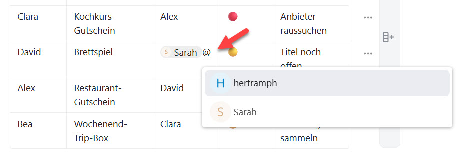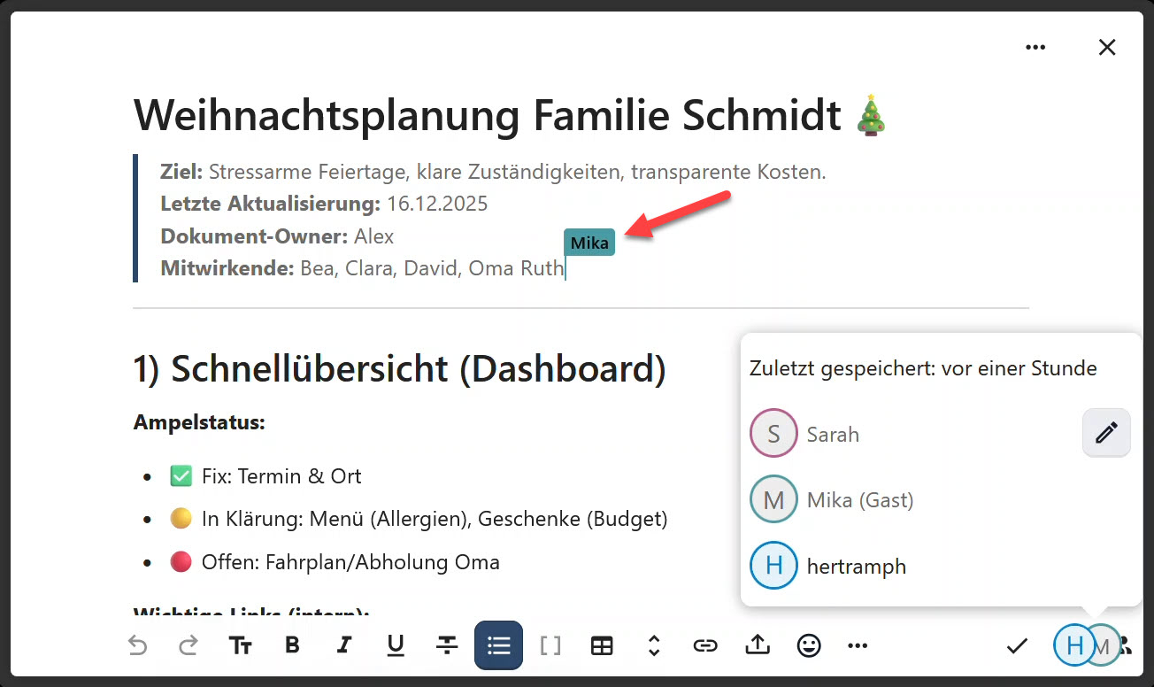 Sofern für die Beteiligten eigene Nextcloud-Konten eingerichtet wurden, kann man deren Namen mit einem "@"-Zeichen an die entsprechenden Stellen einfügen. Damit erhält der Markierte eine Nachricht - ideal für Todo-Vergaben.