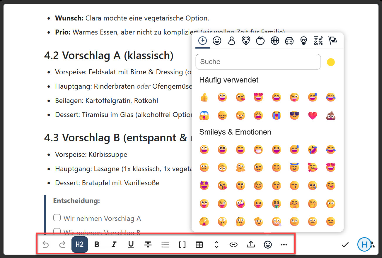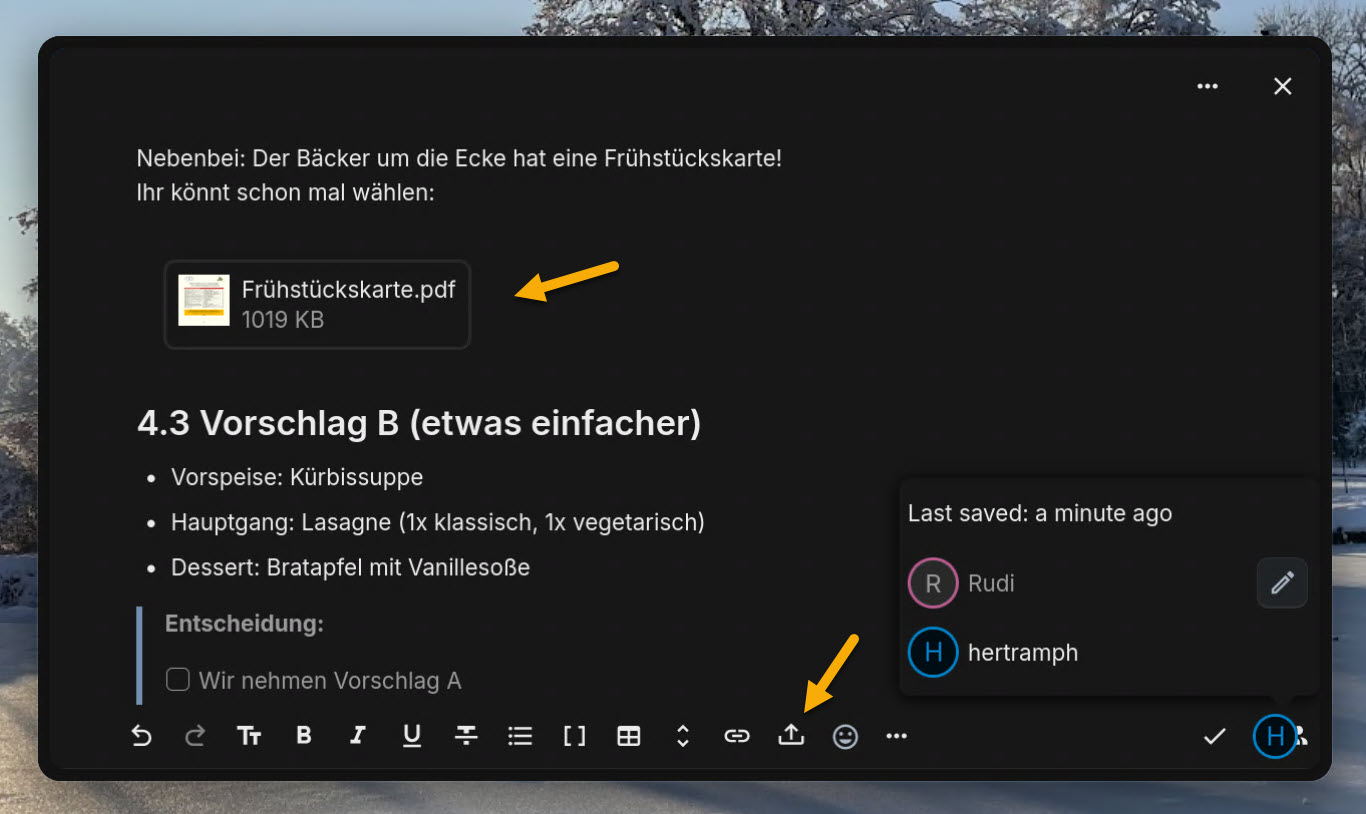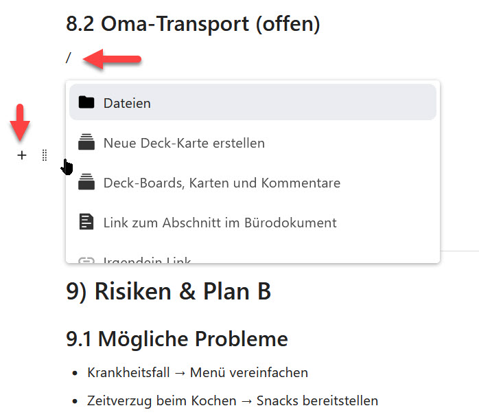 Sofern die Mitschreibenden mit einer Nextcloud vertraut sind, können zusätzliche Funktionen genutzt werden. Durch das Pluszeichen am Rand eines Abschnitts oder das Einfügen eines Schrägstrichs ("/") kann man eine Reihe zusätzlicher Optionen auswählen, etwa auf ein vorhandenes Dokument (z. B. Karte "Frühstücksservice") verweisen.