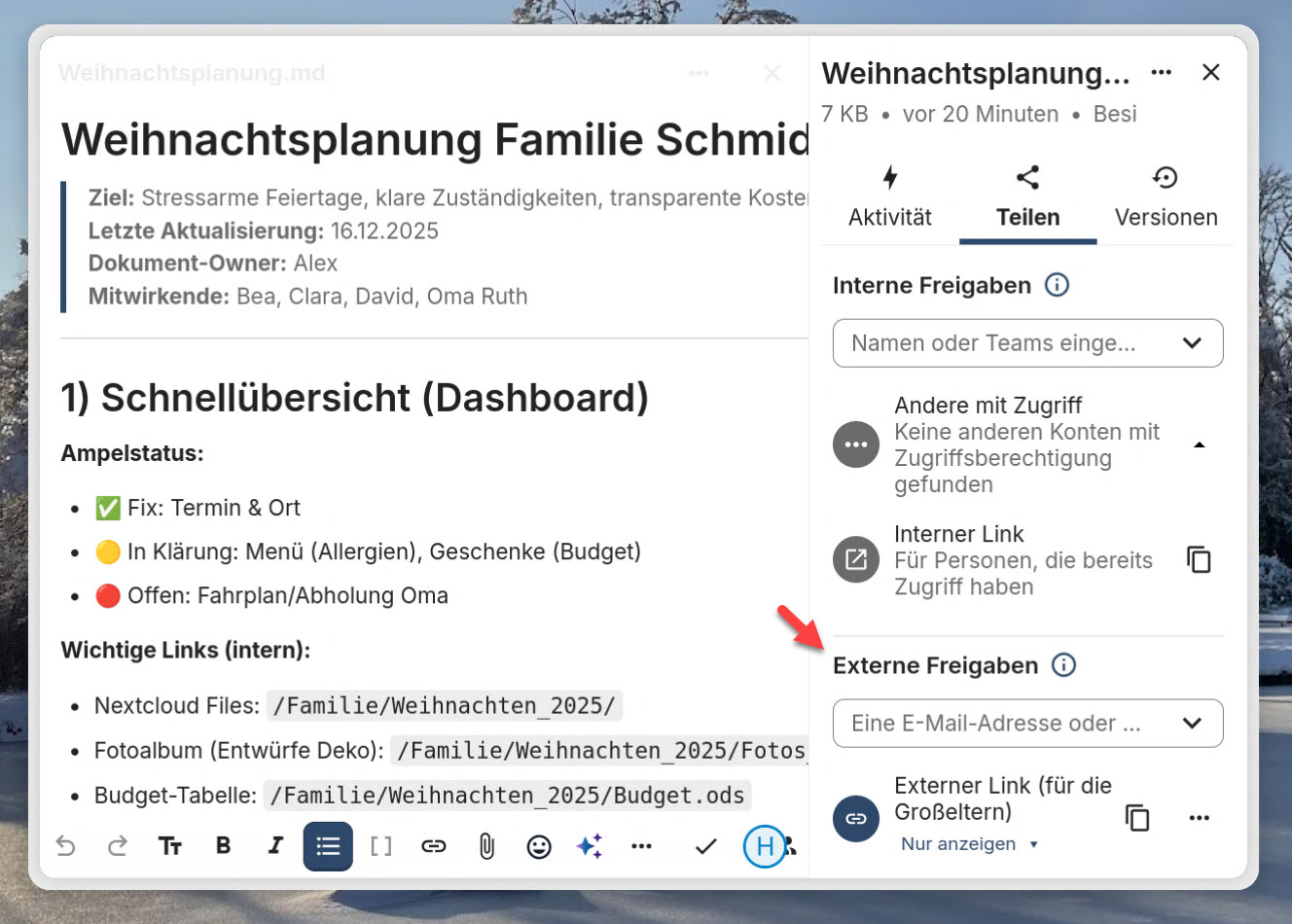 Ein simpler Nextcloud-Link, den man via Mail oder Messenger versendet, genügt schon, um die Mitarbeit zu ermöglichen. Der Empfänger/die Empfängerin benötigt kein eigenes Nextcloud-Konto. Die Einstellungen kann man so vornehmen, wie man das auch von anderen Dateifreigaben kennt. Rechte Sidebar aufrufen und den Freigabelink erzeugen: