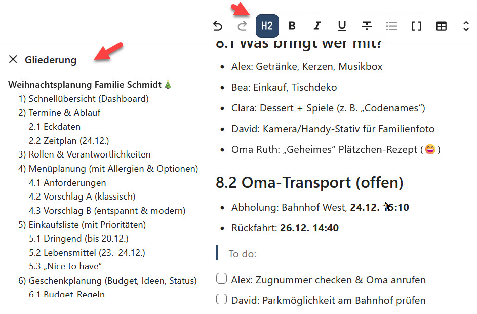 Aus Überschriften und Unterüberschriften entsteht eine Gliederung, die man auf Wunsch einblenden kann. Gleichzeitig kann sie nur Navigation dienen: Klickt man darin einen Punkt an, so springt der Text an die entsprechende Stelle. Der entsprechende Menüpunkt ist etwas versteckt unter dem Überschriften-Button zu finden: