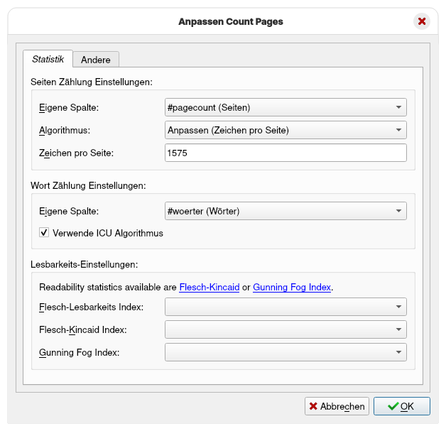 Nützlich ist auch die Calibre-Erweiterung Count Pages, welche die Seitenzahl der Bücher nach eigenen Vorgaben (Anzahl Zeichen pro Seite) sowie die Anzahl der Wörter berechnen kann. Das erst macht E-Books bzgl. deren Umfangs vergleichbar. Vergleichbarer sogar als bei Printausgaben, wo gerne mal mit viel Rand, Zeilenhöhe oder Schriftgröße „geschummelt“ wird. Möchte man Seiten- und Wortzahlen erfassen, müssen zuvor noch entsprechende Calibre-Spalten erstellt werden, die Ganzzahlen aufnehmen. Meine Count Pages Einstellungen sehen so aus: