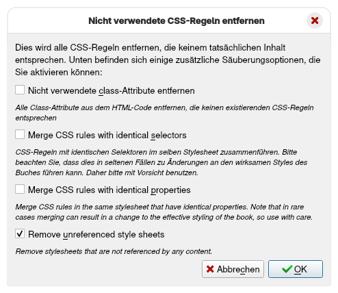 Um die unnötigen CSS-Angaben loszuwerden, öffnet man das Buch mit dem Calibre E-Book Editor (Rechtsklick → Buch bearbeiten). Im Editor klickt man dann entweder in der Toolbar auf den Radiergummi oder wählt im Menü Werkzeuge → Nicht verwendete CSS-Regeln entfernen aus. Im folgenden Dialog kann man noch ein paar Einstellungen machen. Bei mir sieht er so aus: