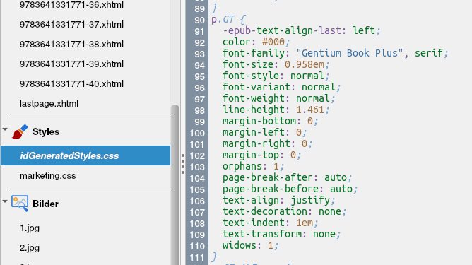 Das war’s im Editor. Wie gesagt, muss man teils etwas suchen, um die relevanten CSS-Regeln zu finden. Oft hilft es, eine der Kapiteldateien zu öffnen, um zu schauen, welche CSS-Klasse(n) für die Absätze verwendet werden (im obigen Beispiel: u.a. GT).
