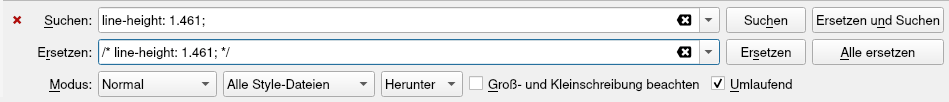 Da sie mehrfach auf diesen krummen Wert festgelegt ist, kommt man am besten über Suchen und Ersetzen weiter. Gibt es mehrere CSS-Dateien, wählt man am besten die Option „Alle CSS-Dateien“ aus: