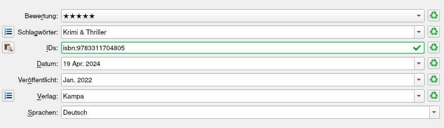 Ergänzt man fehlende Metadaten konsequent, tut man sich bei wachsendem Buchbestand auch leichter mit der Verwaltung und es lässt sich leichter nach Genre/Sprache/Verlag usw. filtern.