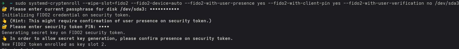 sudo systemd-cryptenroll --wipe-slot=fido2 --fido2-device=auto --fido2-with-user-presence yes --fido2-with-client-pin yes --fido2-with-user-verification no /dev/sdYX