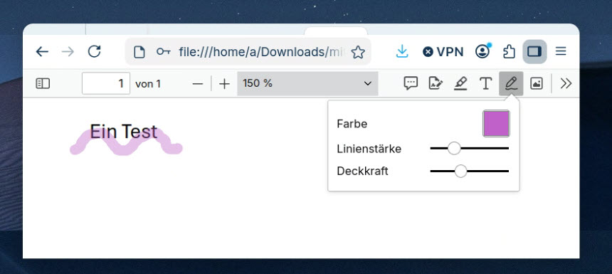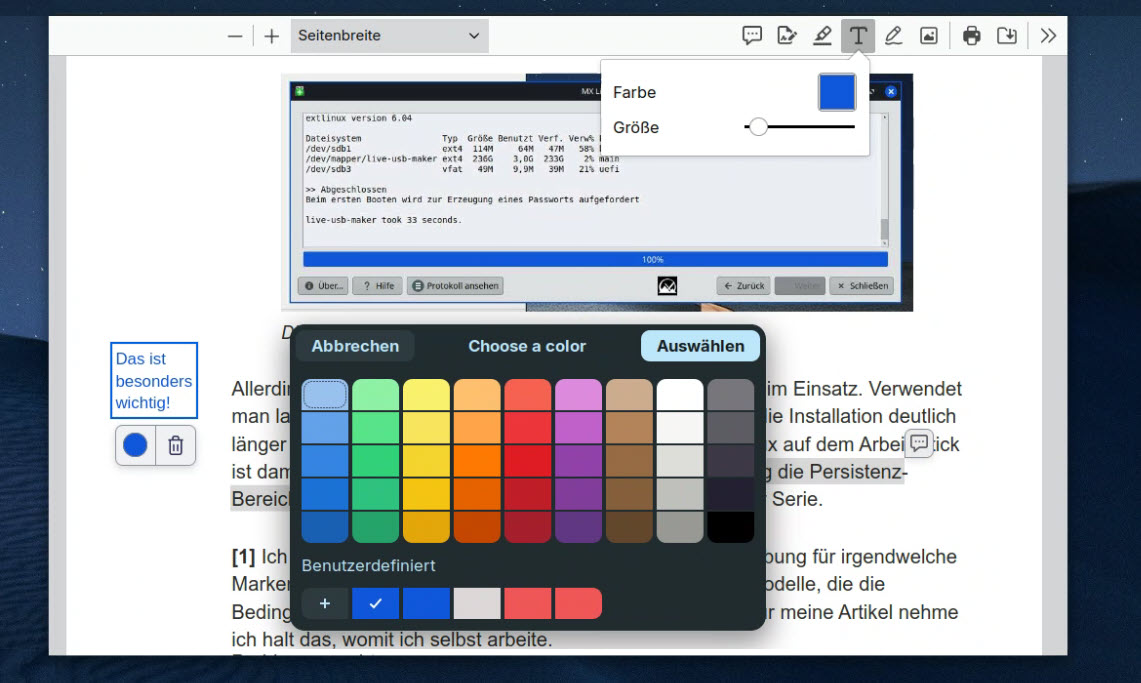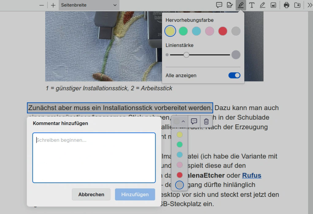 Firefox kann zwar die Elemente einer PDF nicht editieren, also z. B. nicht den Text verändern, aber das Hinzufügen von Grafiken und Texten ist möglich. Das Auswählen von Textfarben ist komfortabler, als dies bei den Kommentaren der Fall war.