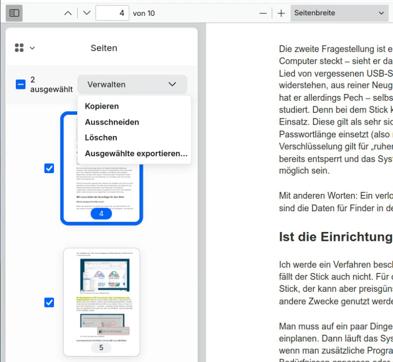 Seiten können ab Version 150 markiert und per Drag-and-drop neu angeordnet, gelöscht oder exportiert werden. Wenn mich aus einem 50-seitigen Dokument nur zwei Seiten interessieren, so kann ich diese markieren und in einem neuen Dokument speichern.