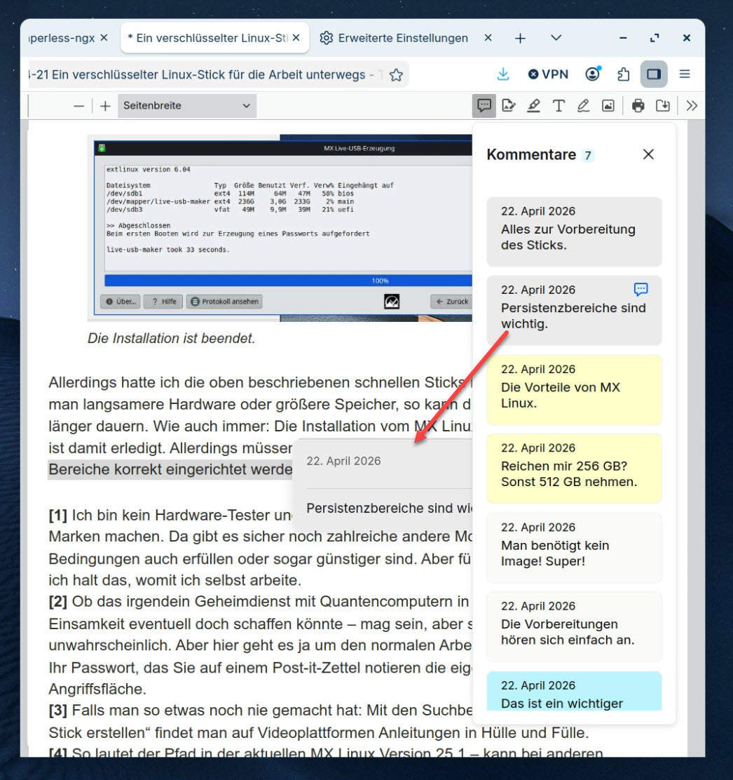 Die Kommentarfelder nehmen dabei die Farbe der Markierung an. In einer Liste werden alle eingefügten Kommentare aufgeführt, mit einem Klick darauf springt man zur entsprechenden Stelle im Gesamtdokument.