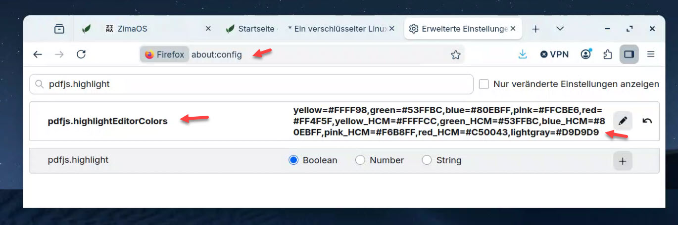 Neue oder zusätzliche Farben für Markierungen können mit "about:config" im Feld "pdfjs.highlightEditorColors" eingetragen werden: