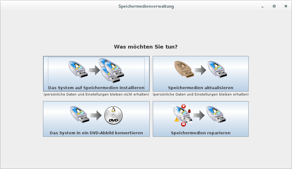- MASTER-Stick erstellen: Diesen Urstick habe ich gebootet. In der Speichermedienverwaltung, die darauf automatisch gestartet wird, habe ich mittels "Das System auf Speichermedien installieren" einen MASTER-Stick angelegt.