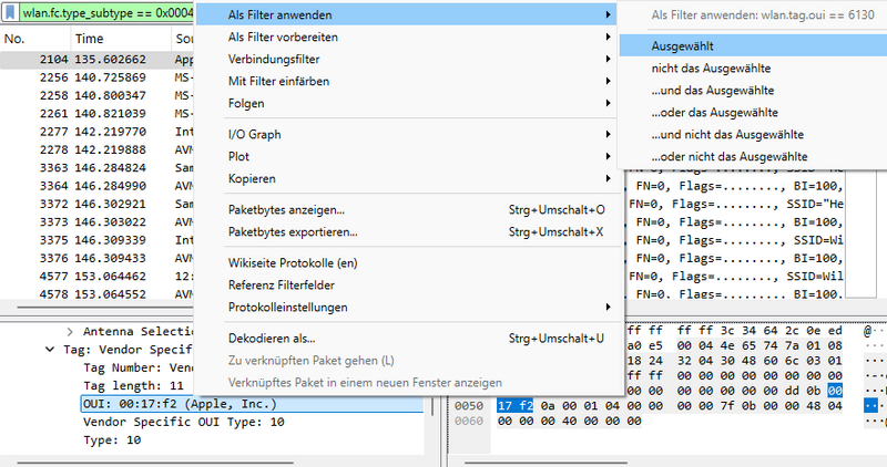 In Abb. 1 ist ein mit der Fritzbox aufgezeichneter Mitschnitt von Probe-Requests und -Responses zu sehen. No., Time ist wie beim DNS-Verkehr die Nummer und Zeit in Sekunden des Datenpakets seit Beginn der Aufzeichnung. Source und Destination sind nun keine IP-, sondern die genannten MAC-Adressen der Geräte. In den Adressen tauchen Herstellernamen, wie Apple oder Intel auf. Der Grund ist, dass bei festen Geräteadressen die ersten 6 Stellen der 12-stelligen MAC-Adresse aus Hex-Zahlen die Herstellerkennung enthalten. Dieser Teil der Adressen ist in der Aufzeichnung bereits dekodiert und gibt Aufschluss auf den Gerätetyp. Hinter "Intel_.." steckt im allgemeinen ein PC, hinter "Apple_.." meist ein iPhone oder iPad, hinter "SamsungEl.." ein Androidgerät dieses Herstellers und hinter "AVM.." eine Fritzbox. Der Datenverkehr in Abb. 1 besteht also ausschließlich aus nicht-randomisierten, festen Geräteadressen, da bei Randomisierung keine Herstellerkennung gesendet würde. Broadcast erscheint als Destination, wenn der Probe-Request kein bestimmtes Ziel hat, daher alle Router zur Antwort aufgefordert sind. Jeder Probe-Request und -Response hat eine bestimmte Länge, Length in Byte. Die kurze Sequenz in Abb. 1 zeigt, dass diese Länge in aufeinanderfolgenden Probes für dasselbe Gerät konstant bleibt und über eine große Bandbreite von ca. 50 Bytes bis zu mehreren 100 Bytes zwischen Geräten variiert. Im Feld Info tragen die Probe-Requests eine Seriennummer. Wenn auf SN=182 SN=183 folgt, sind dies aufeinanderfolgende Probes desselben Geräts. Schließlich enthält Info die SSID, also den Namen des Netzes, an das sich der Probe richtet. Im Fall von SSID=Wildcard wird kein bestimmtes Netz angesprochen, der Client spricht alle Netze in Reichweite an. Wird ein SSID mit Namen genannt, wie im Beispiel "He**" sucht der Client eine Verbindung mit dem genannten Netz. Wird in Wireshark ein Datenpaket markiert, wird im Fenster links unterhalb der Datenpakete der "Payload", also Inhalt des Datenpakets angezeigt, im Beispiel in Abb. 1 also die 58 Bytes an Daten, die das Samsunggerät sendet. Wireshark erlaubt, auf beliebige Parameter eines Datenpakets zu filtern, indem der Parameter markiert wird und mit Rechtsklick im sich öffnenden Menü als Filter ausgewählt wird. In Abb. 2 wird auf den Parameter "OUI: 00:17:f2 (Apple, Inc.)" ein Filter angewandt, den Applegeräte nicht nur als MAC-Prefix, sondern auch als Vendor-Tag im Payload tragen. Wireshark erzeugt damit selbständig den Filter "wlan.tag.oui == 6130", der auf Applegeräte filtert.