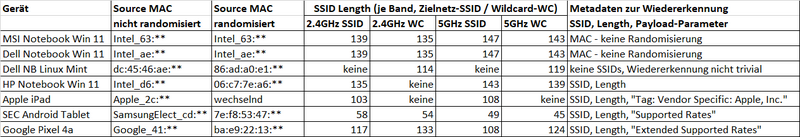 Abb. 4: Vergleich der Eigenschaften von WLAN Probe-Requests mit und ohne Randomisierung der MAC-Adresse, für verschiedene Geräte und Betriebssysteme, sowie die Parameter, mit denen ein Gerät bei Randomisierung, ohne MAC-Adresse eindeutig identifiziert werden kann.