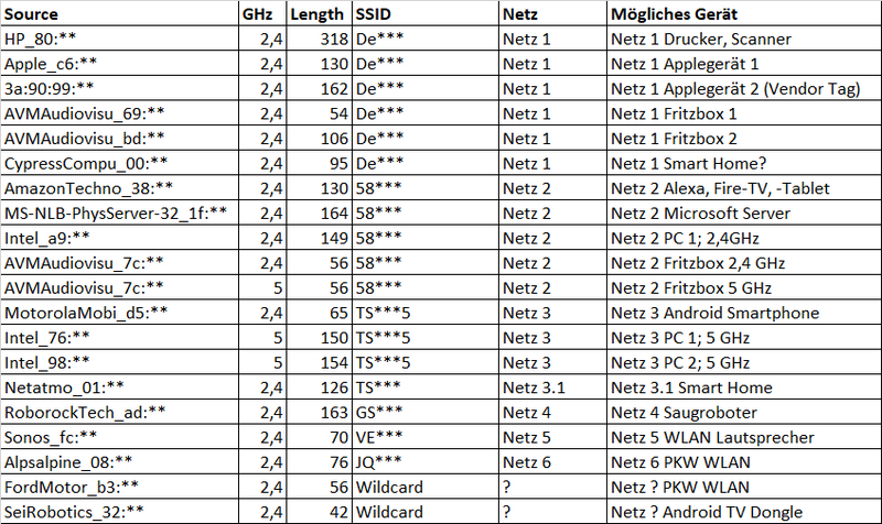 Mit den an bekannten Geräten gewonnenen Erkenntnissen zu Probe-Requests ist im zweiten Schritt nun das Ziel herauszufinden, was Probe-Requests unbekannter Geräte verraten, die in der Nachbarschaft, in Reichweite der Fritzbox senden und deren Probes daher von der Fritzbox erfasst werden. In Abb. 5 ist eine Auswahl solcher Geräte aufgelistet. Um die Privatsphäre meiner Nachbarn zu schützen, sind eindeutige Kennungen, wie SSIDs, MAC-Adressen geändert oder verkürzt.