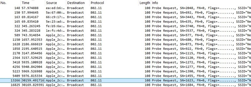 Abb. 6: Aufgezeichnete Probe-Requests des iPad im verbundenen Netz, 5GHz in den Zuständen "Flugmodus" (1680s-3140s), "WLAN aus Schnelleinstellungen" (3200s-5800s), "WLAN aus Einstellungen" (6000s-30120s). Im Flugmodus werden bei 2186s und 2195s Probes gesendet, bei WLAN aus nicht. Das iPad randomisiert teilweise auch bei abgeschalteter Randomisierung (Probes No. 148-324)