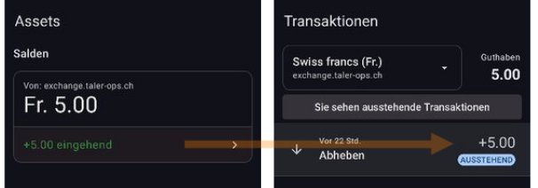 Bei den Assets (das ist der Startbildschirm in der Taler-App) sieht man, dass ich 5 Franken in der Geldbörse (Taler-Wallet) habe. Ausserdem gibt es eine ausstehende Transaktion in Höhe von ebenfalls 5 Franken. Das ist die Überweisung von meinem Privatkonto, auf die das Wallet wartet.