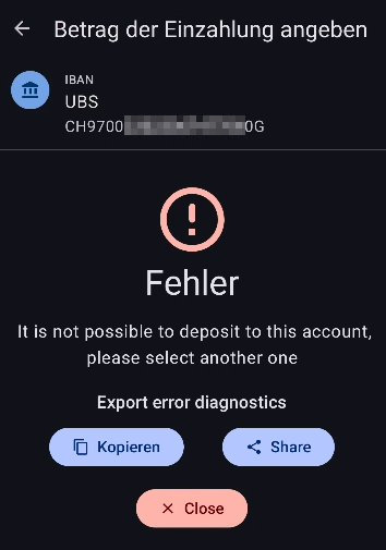 Ich habe 10 Franken auf meinem Wallet. Dann tippe ich auf Einzahlen um die Überweisung von der Wallet auf mein Bankkonto auszulösen. Nun wähle ich das Zielkonto aus. Aber Achtung! Die Überweisung auf ein von Hand angelegtes Konto funktioniert nicht. Das geht nur, wenn man vorher eine Zahlung vom Bankkonto auf das Wallet erhalten hat, weil dadurch ein korrekter Bankkonto-Eintrag in der App erzeugt wurde. Diesen müsst ihr auswählen. Im Screenshot seht ihr den Falschen (UBS alt) und den Richtigen (Es wurde kein Kürzel angelegt). Ändert die Daten dieses Bankkontos nicht; nein, auch nicht die Beschreibung, weil es danach nicht mehr funktioniert.