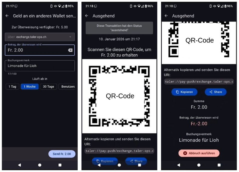 Damit Lioh das Geld empfangen kann, muss ich den QR-Code oder die URI an Lioh über einen anderen Kanal übermitteln, z. B. per E-Mail oder über einen Messenger. Lioh kann nun den QR-Code oder die URI in ihrer Taler-Wallet eingeben, um den Geldempfang auf ihrer Seite auszulösen.