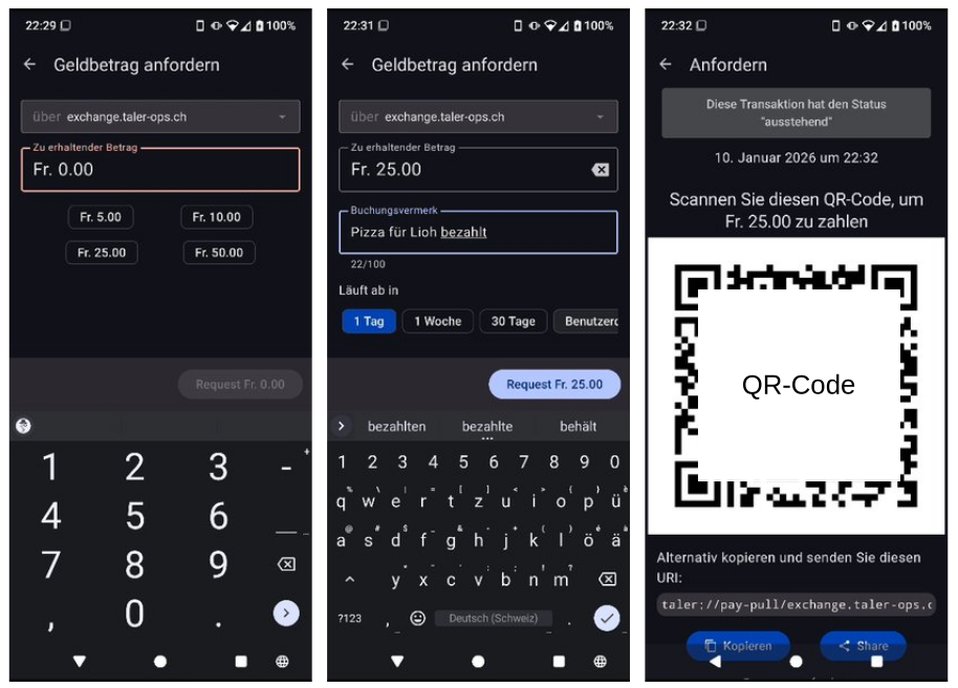 Nach dem Klick auf die Schaltfläche "Erhalten" gibt man den angeforderten Betrag ein. Dann fügt man einen Buchungsvermerk und ein Ablaufdatum für die Forderung ein. Nach einem Druck auf "Request Fr. 25.00" erscheinen die Transaktionsdaten (QR-Code und URI). Diese übermittelt man an die zahlungswillige Person, welche den Code in der Taler-App eingibt, wie ich es im vorherigen Kapitel beschrieben habe.