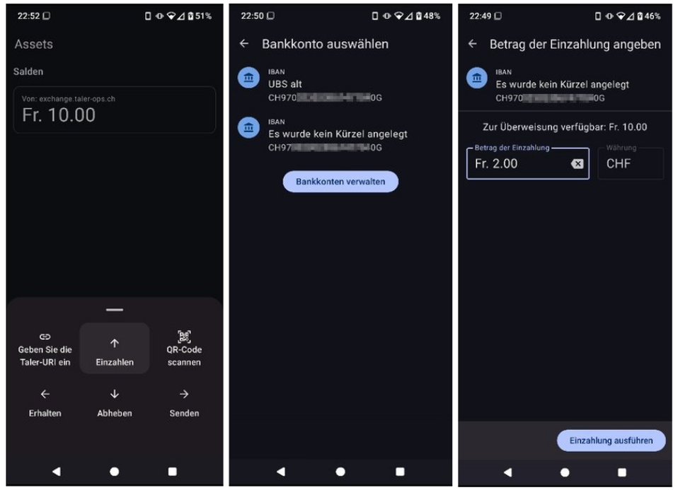 Das ist die umgekehrte Aktion wie das "Abheben". Damit überweist man einen Betrag vom Wallet an die eigene Bank. Man könnte meinen, dass eine Voraussetzung dafür ist, dass man die Bank in den Einstellungen der Taler-App vorgenommen hat. Dem ist nicht so. Falls ihr dennoch euer Bankkonto eingegeben habt, werdet ihr Folgendes erleben: Um die Überweisung an die Bank auszulösen, klickt man im Menü auf die Aktivität "Einzahlen" und wählt dann das Zielkonto aus.