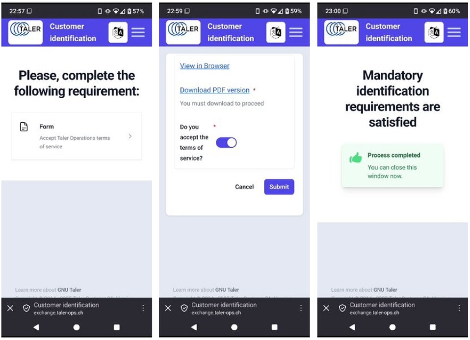 Jede Transaktion mit GNU Taler benötigt eine zweiseitige Aktion. Da sich die Transaktionspartner nicht kennen (technische Anonymität), müssen beide eine Aktion ausführen.