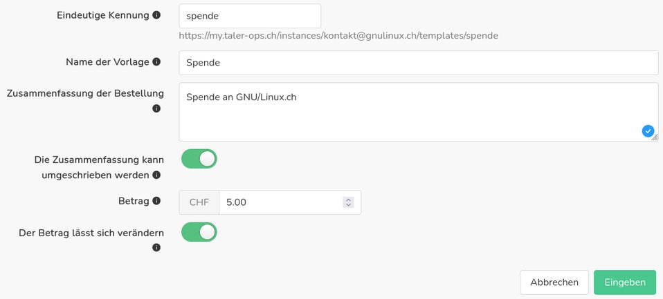 - Die 'Zusammenfassung der Bestellung' wird einem Spender in der Taler-App (Wallet) als Verwendungszweck angezeigt. Den Schalter darunter solltet ihr eingeschaltet lassen, damit die Spenderin ihren eigenen Verwendungszweck eingeben kann.
