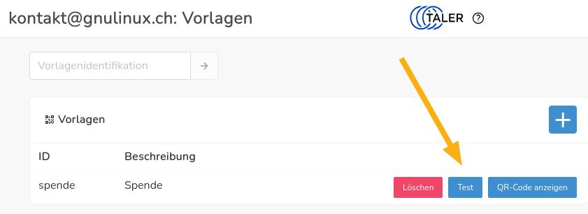 Zu diesem Zweck legt man im Taler Backoffice eine Vorlage an. Dazu klickt man im Menü auf Vorlage und dann auf das Plus-Symbol.