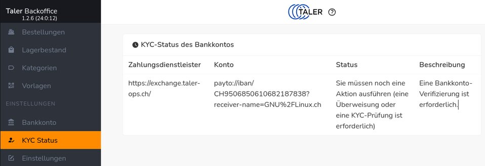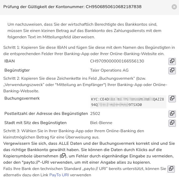 Lange Rede – kurzer Sinn: Ihr überweist einen kleinen Betrag (1.00 CHF) an die Taler-Exchange, um euch zu legitimieren. Dann wartet ihr, bis die Überweisung abgeschlossen wurde und damit eure Bezahlvorlage in Ordnung ist. Das könnt ihr überprüfen, indem ihr erneut auf Test klickt: