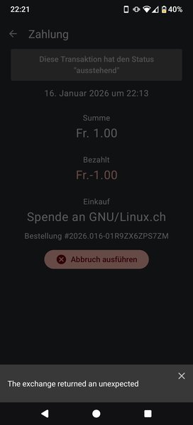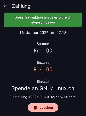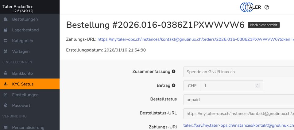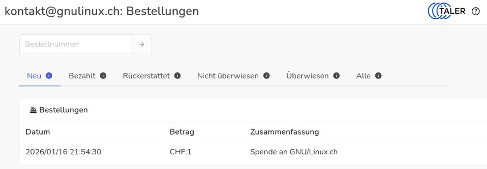 Nun gilt es abzuwarten, bis die Spende auf dem Vereinskonto angekommen ist. Das funktionierte bei mir tagelang nicht. Auch vom GNU-Taler-Team gab es leider keine sachdienlichen Hinweise.