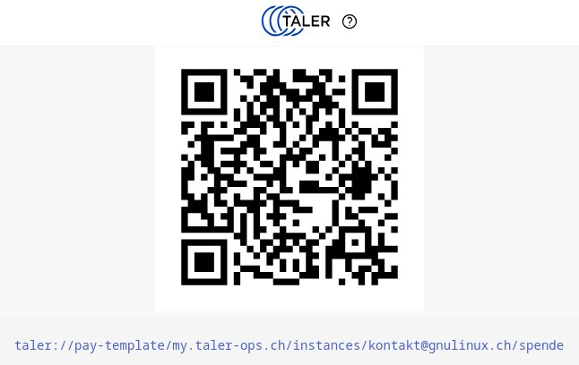Diesen QR-Code, bzw. die URI, könnt ihr auf eurer Website, im Kiosk oder bei einer Veranstaltung bereitstellen, um Spenden/Einzahlungen auf euer Taler-Konto zu ermöglichen.