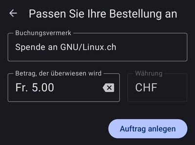 Hier kann man den Buchungstext und den Betrag anpassen (ich habe ihn auf 1 Franken geändert). Beide basieren auf den Voreinstellungen im Template. Dann tippt man auf Auftrag anlegen, um die Spende abzuschicken. Die Überweisung muss danach bestätigt werden (ohne Screenshot). Die Bestätigung der Überweisung: