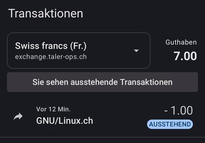 Sobald die Zahlung vom Taler-System verarbeitet wurde, steht im Wallet nicht mehr ‹AUSSTEHEND›, sondern das hier: