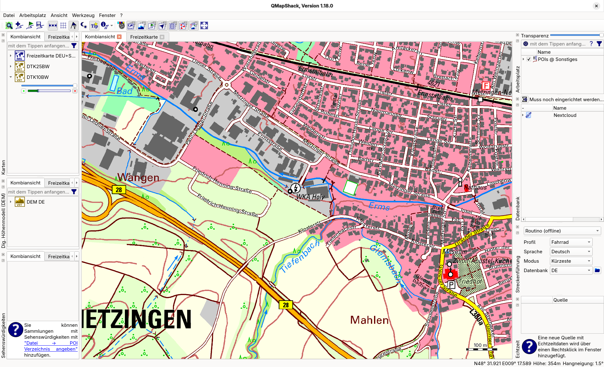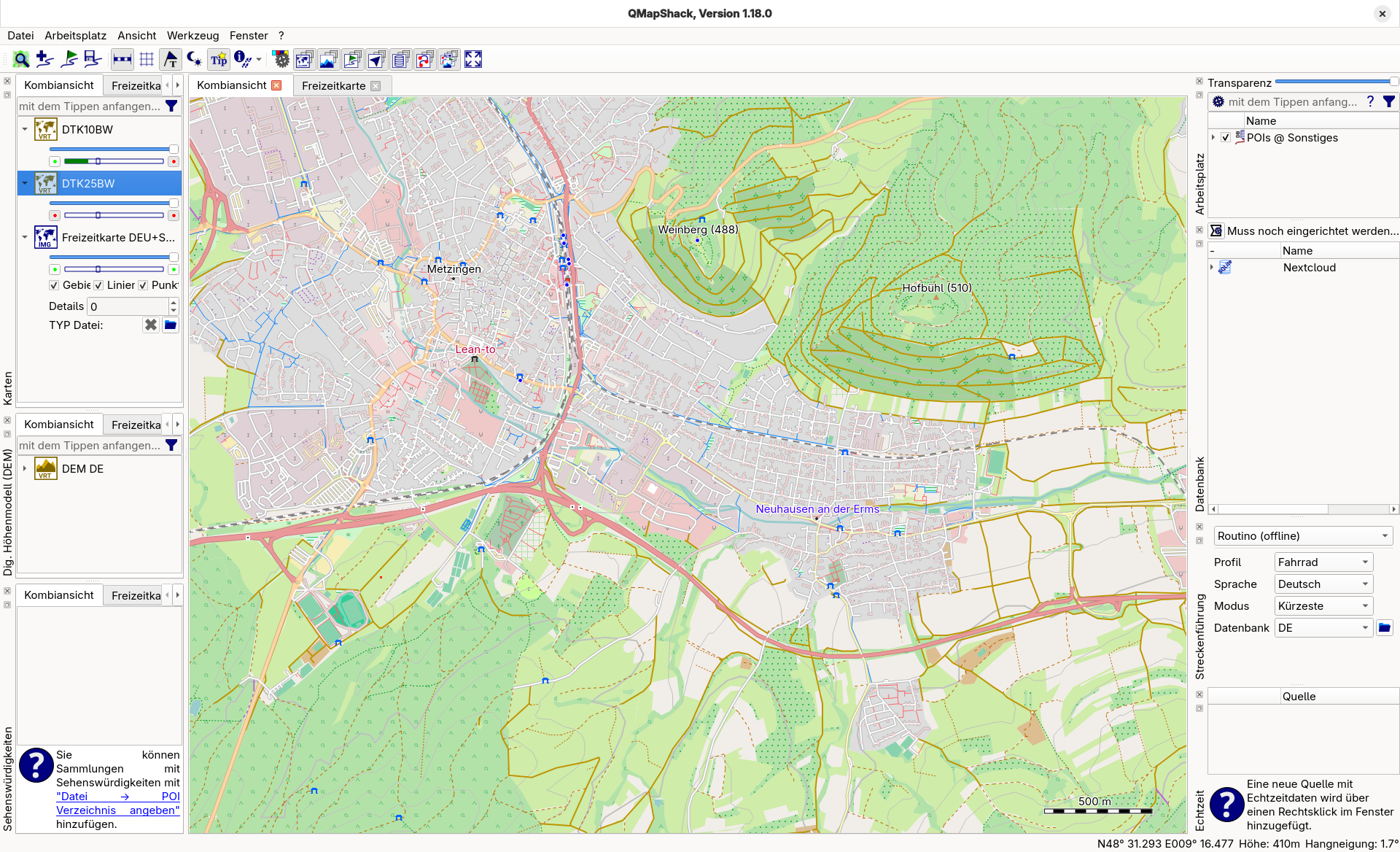 Ich denke, der Artikel hat gezeigt, dass QMapShack ein sehr vielseitiges Werkzeug ist. Verschiedene Karten lassen sich zu Kartenstapeln kombinieren und nach Belieben ein- oder ausblenden. Durch die Kombination verschiedener Ansichten kann man sich den Kartenausschnitt schnell in verschiedenen Kartendarstellungen visualisieren.