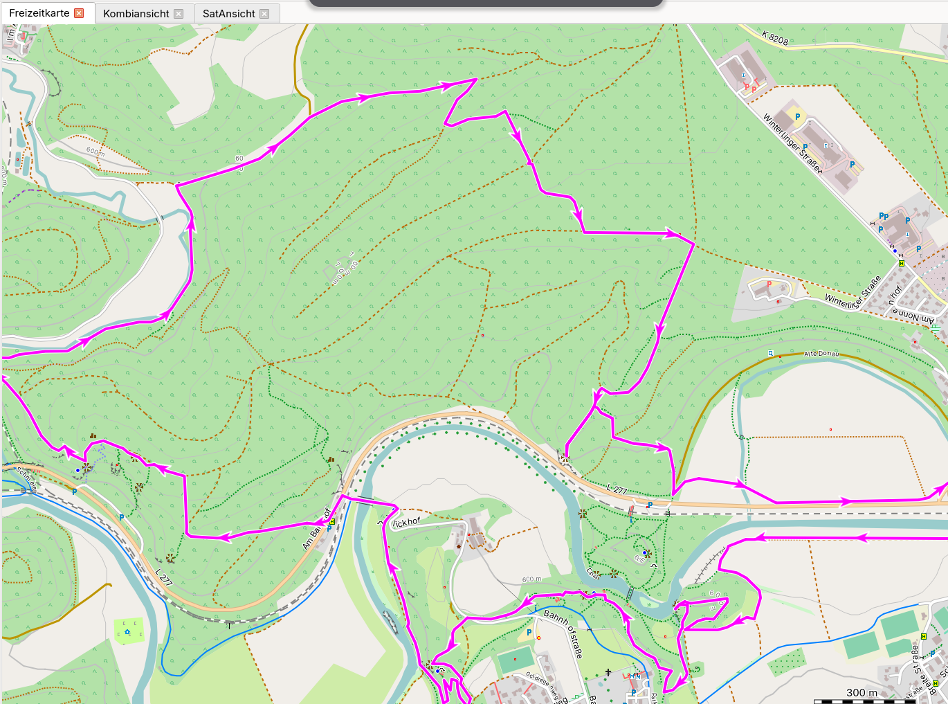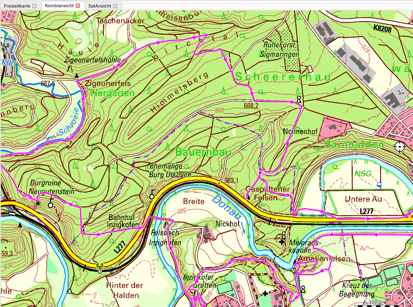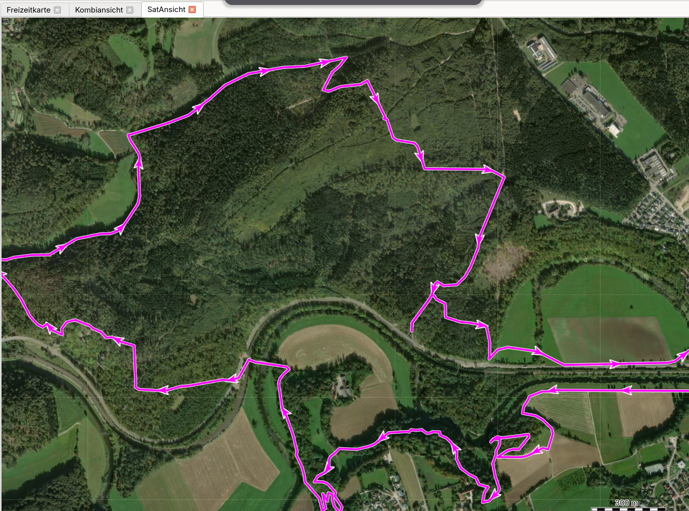 Über die Funktion Ansicht → Kartenansichten verbinden wird beim Zoomen oder beim Verschieben des Kartenausschnitts die jeweils andere Ansicht mitgeführt. Hat man also einen Track in der einen Ansicht ausbaldowert, braucht man bloß auf den Reiter der anderen Ansicht klicken, und schon wird der Track auf der anderen Karte angezeigt; man braucht nicht erst die Stelle zu suchen.