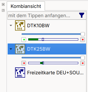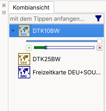 Als Erstes aktivieren wir nur die 1:10.000 Karte DTK10BW (über das Kontextmenü) und stellen den Zoomlevel ein, bei dem diese Karte gerade noch verwendet werden soll. Sprich, beim nächsten Verkleinerungsschritt (Herauszoomen) soll diese Karte dann nicht mehr verwendet werden. Wenn sie zuvor mit dem VRT Builder ohne Übersichtsebenen erstellt wurde, wird sie auch nur bei relativ großem Zoom angezeigt. Also nicht wundern, wenn die Kartenansicht zunächst leer bleibt. Anschließend klicken wir auf den kleinen Pfeil neben dem Kartensymbol, sodass weitere Schaltflächen aufgeklappt werden. Ein Klick auf den rechten grünen Punkt – er wird dann Rot – legt den aktuellen Zoomlevel als den Maximalen beim Herauszoomen fest.